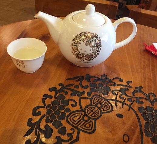 餐厅的装修以中国风融合了凯蒂猫的可爱,餐桌和餐具、茶壶都有凯蒂猫的图案。甚至筷架也是凯蒂猫佩戴的蝴蝶结形状,少女心满满的Hello Kitty迷们必然大呼过瘾。