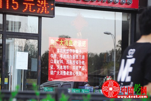 走访中记者看到,许多临街的烧烤店、火锅店都张贴出"告示",内容大同小异,有的称自己的牛羊肉来自新西兰,有的称来自内蒙古,并表示可以给顾客出示进货单、检验检疫证书等"证据"。