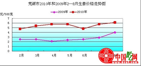 附件:芜湖市2009和2010年2—8月的生姜价格统计表和走势图