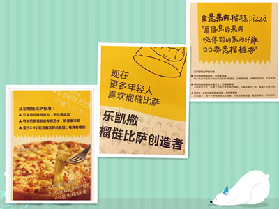 在乐凯撒的菜单中,我们从这张菜单上可以看出他清晰的产品、人群定位,可以感受到这张菜单里的披萨都是通过大量调研和实践的考查和筛选而得出来的,招牌菜品的照片也很精美,引起过很多食客的关注。所以,在餐厅的经营管理中,菜谱应能体现餐厅的服务和经营风格,并能反映出餐厅的整体形象,一本特色的菜单,使餐饮多了一些情趣,多了一些享受。既可以让顾客产生深刻的印象,也可以扩大餐厅的影响力。