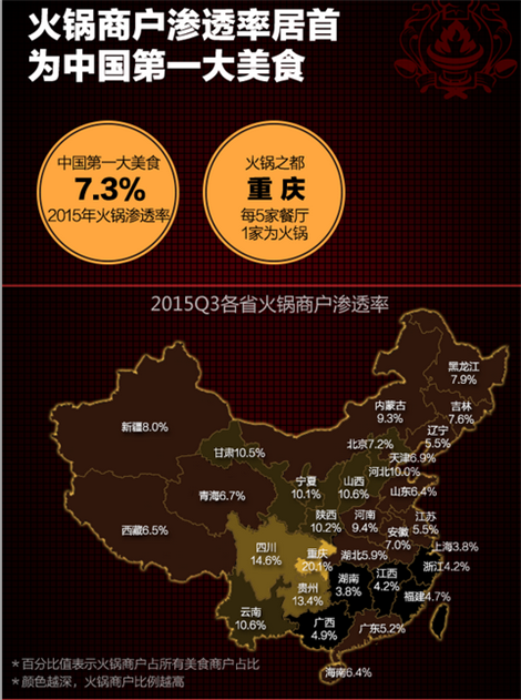 联商网消息:近日,美团、大众点评研究院发布的《中国火锅大数据报告》显示,火锅已成为广受食客欢迎的中国第一大美食,用他们的额话说,便是"火锅经济正当道"。调查显示,全国共计超过35万家火锅商户,火锅商户渗透率为7.3%,已经成为我国第一大美食。