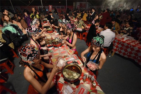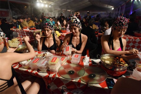 合肥万人吃火锅宴 “京剧”比基尼模特陪吃