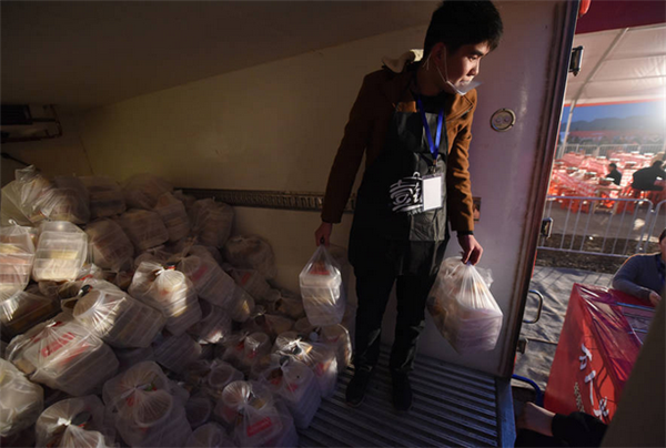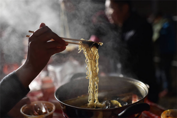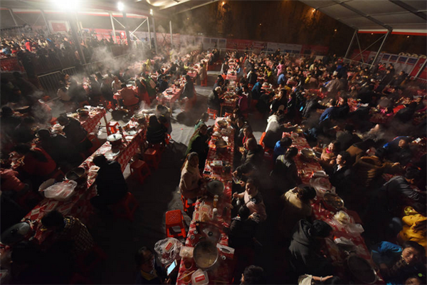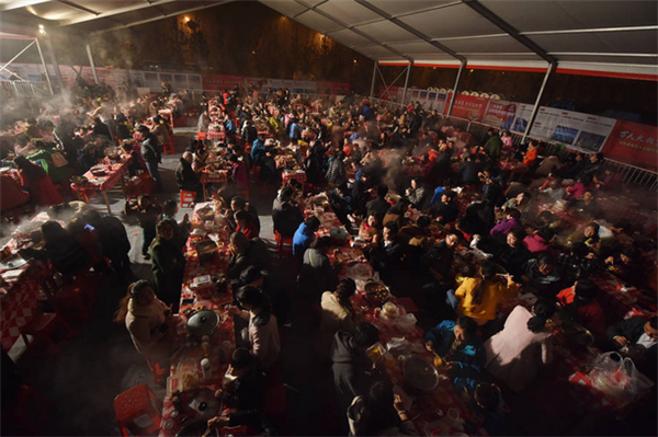 火锅宴从晚上6:20开始,持续两个小时,食料用了两卡车。据悉,火锅宴总共五百多桌,食客都是当地市民。图为火锅宴现场。