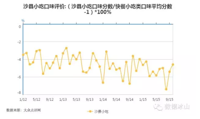 通过使用指标:(沙县小吃口味分数/快餐小吃类口味平均分数-1)*100%来评价沙县小吃的口味,可以看到,沙县小吃的味道一直低于快餐小吃类店铺的平均水平,且与快餐小吃类店铺口味差距逐年拉大。常年如一,地方性局限的味道也很难提高消费者的忠诚度。