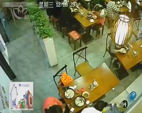 邻座女顾客离开,白衣女子将装了尿的碗放到桌子底下