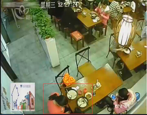 餐厅店内监控录像显示,本周三中午12时28分左右,两名女子带着一个大约4、5岁的小男孩到店用餐,点了两份老鸭粉丝汤。其中白衣女子拿着一个瓷碗伸到小孩身边,大约十几秒钟后,又端到桌上。由于同行的红衣女子挡住了小孩,没办法清晰看到接尿的过程,而该餐桌又位于角落,她们身后的监控器也只能拍到白衣女子的手部动作,但是从动作看,碗里从无到有装了液体。
