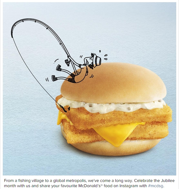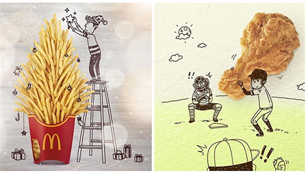 最近,新加坡的麦当劳通过Instagram晒出了一系列萌趣化的麦当劳食品:薯条组成了烟花、苹果派变身小猫、还有坐在汉堡上钓鱼的漫画小人。麦当劳还鼓励用户自己创作涂鸦作品,并在社交网络上晒出来。