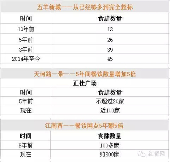 根据《美食导报》的统计数据显示,在广州一些大型商业闹市区,新增加的食肆数量与5年或10年前相比,呈现爆炸式增长。尤其是罗冲围地区,近10年餐饮店数量增长几乎达到300%。