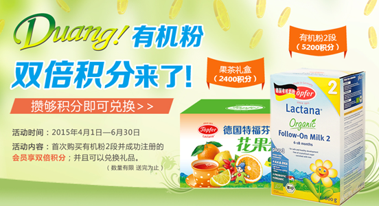 对于父母来说,孩子的健康成长是一种责任,德国特福芬为孩子成长负责的同时更为广大家长朋友提供更快赢取积分的机会,并且赢取计划力度前所未有。自2015年4月1日起至6月30日,凡首次购买有机粉1、2段并成功注册的会员,即可享受有机粉双倍积分,随着活动进一步展开,引领全民疯抢的同时好口碑不断,让德国特福芬再一次赢得品质的认可。