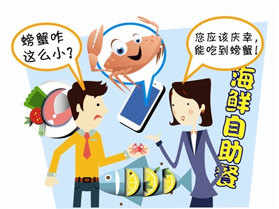 “我从一个美食的微信号上看到了这家海鲜自助餐,后来带着朋友去了一回,心理落差相当大!”喜欢到处找美食的市民小刘边说边向记者展示其微信上的美食推荐信息。记者注意到,对这家海鲜自助,该美食微信号的推荐可谓是图文并茂,照片上满满一筐看上去新鲜无比的螃蟹,下面还配文“这螃蟹看着个头儿就不小”。对此,已有“亲身经历”的小刘表示,去之前觉得68元的自助餐能吃到新鲜的“大螃蟹”还挺超值的。实际到了餐厅才发现,所谓“大螃蟹”其实大都只有iPhone5手机那么大,可是对于自助餐里螃蟹的大小,其实也没有明确的标准,所以只能是既失望又无奈。