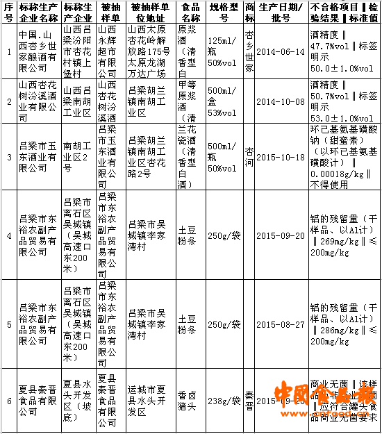 中国食品报网讯 近日,从山西省食品药品监督管理局2016年食品安全监督抽检信息公示(第3期)获悉,本期公布253批次监督抽检结果,涉及酒类、粮食及粮食制品、肉及肉制品、水果及其制品、蔬菜及其制品、食用油、蛋及蛋制品、乳制品、罐头和饮料等10大类。其中,不合格6批次,合格247批次。